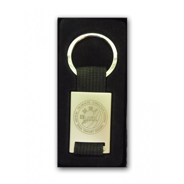 Porte-clés rectangulaire en métal mat. Le logo de l' école de la vague bleue est gravé sur la face avant
